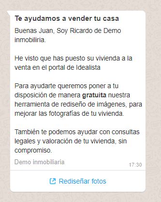 Envía un mensaje automático (una plantilla de la API de WhatsAPP) pre-aprobada, en la cual lleva algunas variables para cada usuario (su nombre, y lugar de contacto, si fue encontrado en Idealista o Fotocasa)