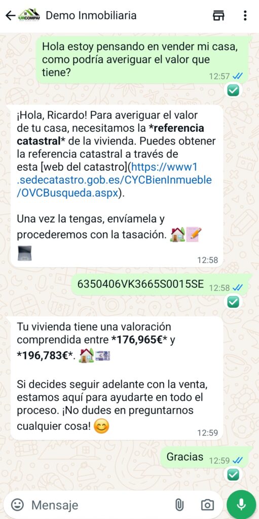 El asistente puede valorar el precio aproximado de mercado de una vivienda en base a su referencia catastral. Esta herramienta es especialmente útil para conocer posibles nuevos vendedores en su zona, dado que les ofreces una manera simple de poder valorar el posible precio de su vivienda.